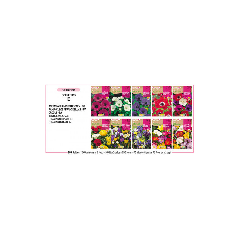 900 bulbos, 100 bulbos por 5 variedades diferentes de anémonas, 100 bulbos de crocus, 75 bulbos de iris y 75 bulbos por 2 diferentes variedades de freesias